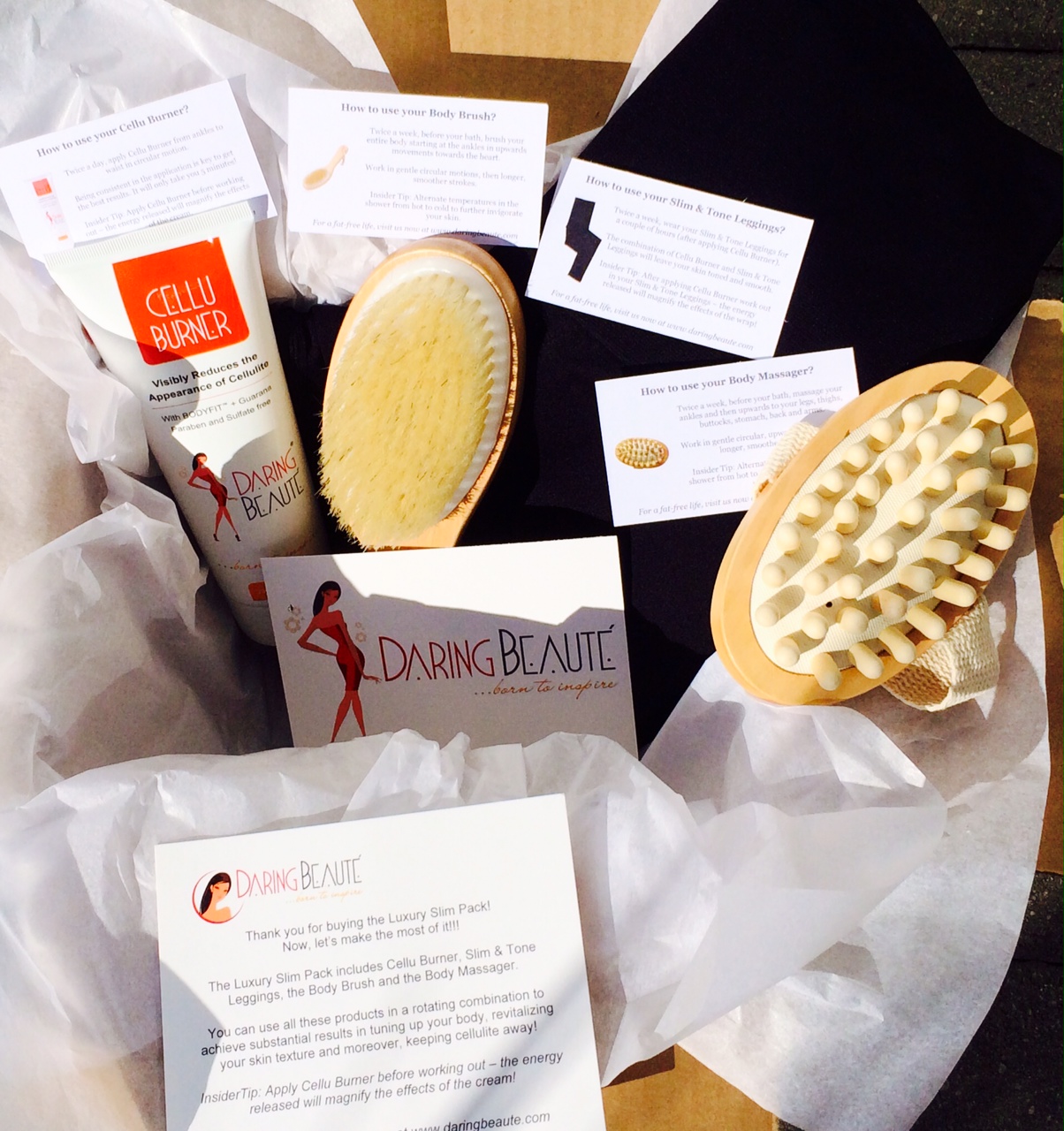 I tried the Daring Beaute Luxury Slim Pack with exactly that goal in mind (lofty though it may be). I’ve lost the pounds I wanted to over the last year and a half doing it the right way: eating right, exercising regularly, not going overboard and developing good habits so the weight stays off. But in its place, there’s some cellulite. To which I say “no, sir.”