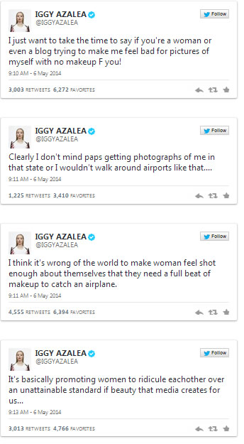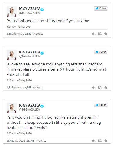 Even when good ol’ Eye-Gee-Gee-Why isn’t looking so fancy, she makes me squeal with her swagger. When she got blasted for rocking a low-maintenance look for an early flight (pictured right), she retorted with some zinger tweets: